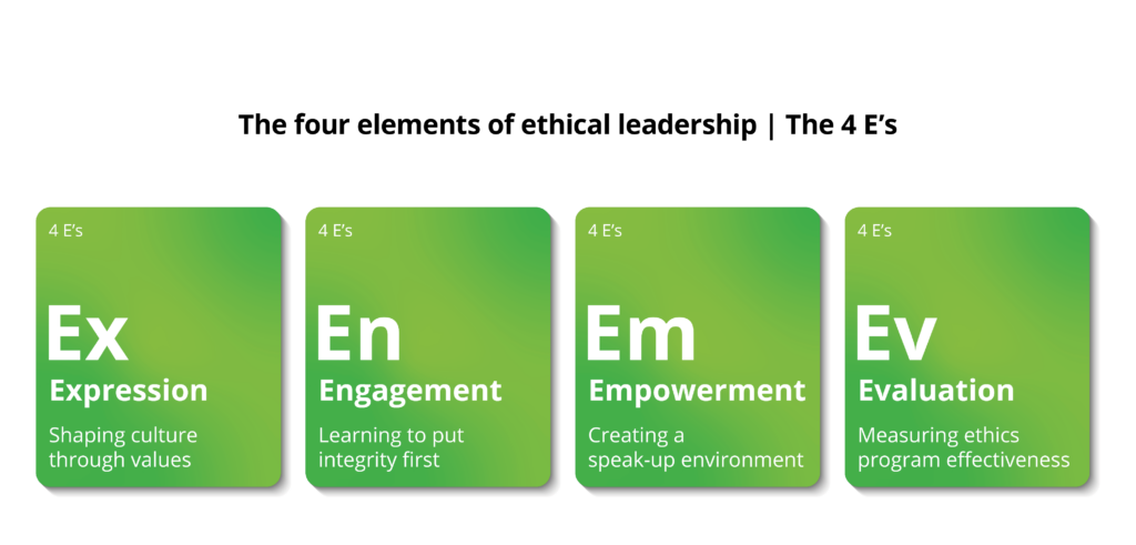 Effective ethical leadership helps ensure the ethical choice is the reflexive choice. The four elements of ethical leadership, or the 4 E’s, provide an actionable leadership approach for building ethical cultures: